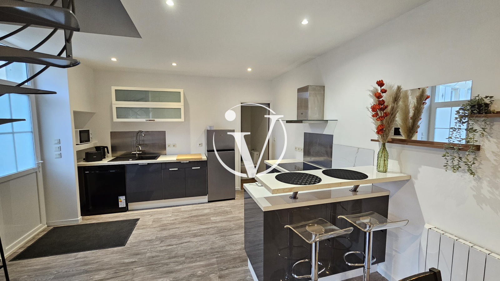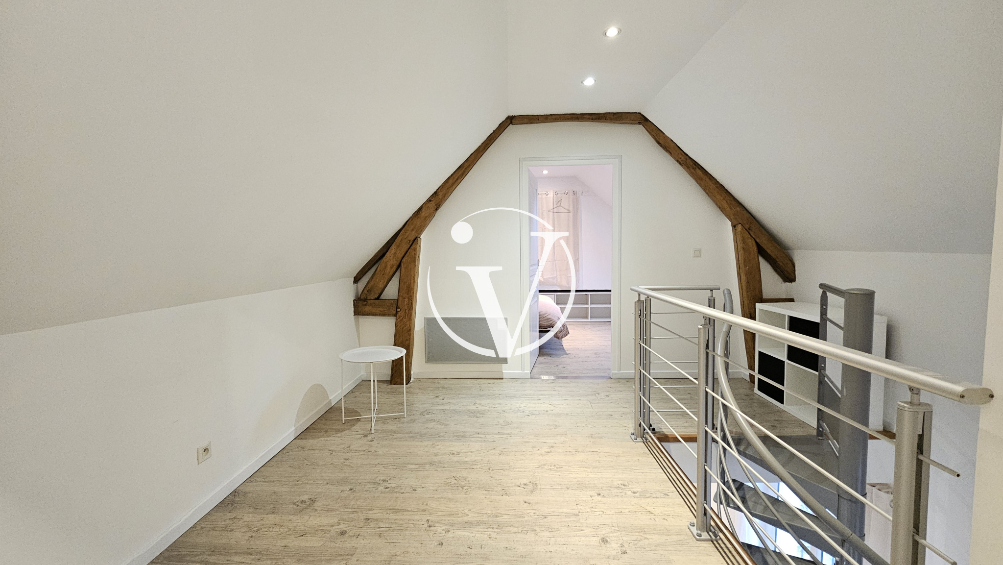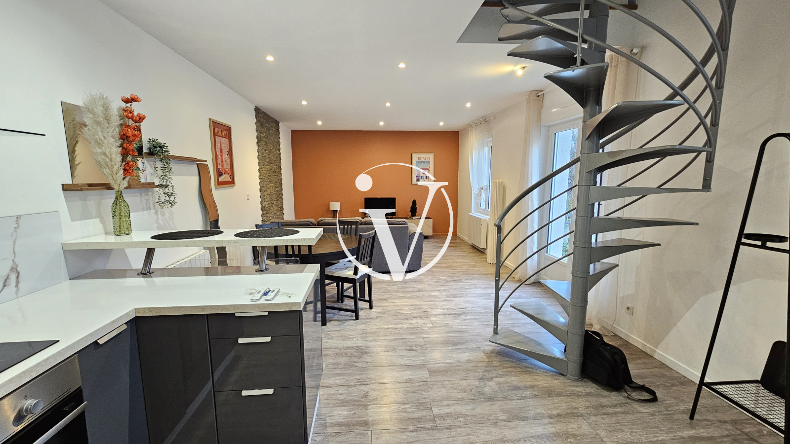 Vendôme (41100)Proche centre ville, dans cour commune, bel appartement T2 MEUBLE de 56 m², en duplex, comprenant au 1er niveau : une pièce de vie avec cuisine aménagée et équipée (plaque de cuisson, hotte, four, lave-vaisselle, micro-ondes, réfrigérateur), wc avec machine à laver ; au second niveau : un palier faisant office de bureau, chambre avec rangements, salle d'eau-wc. Balcon et cave. Provision pour charges : eau froide, charges générales de copropriété.