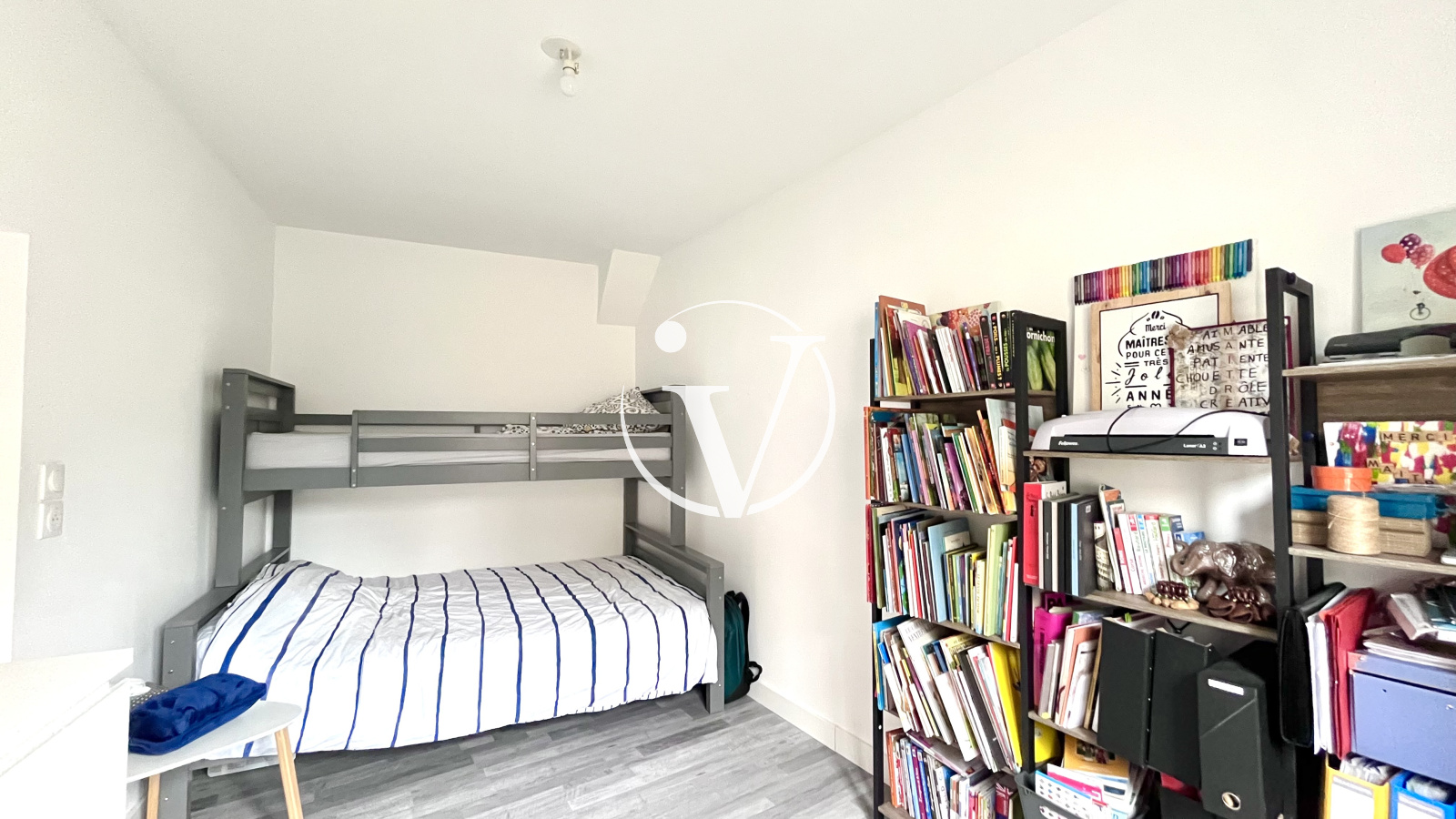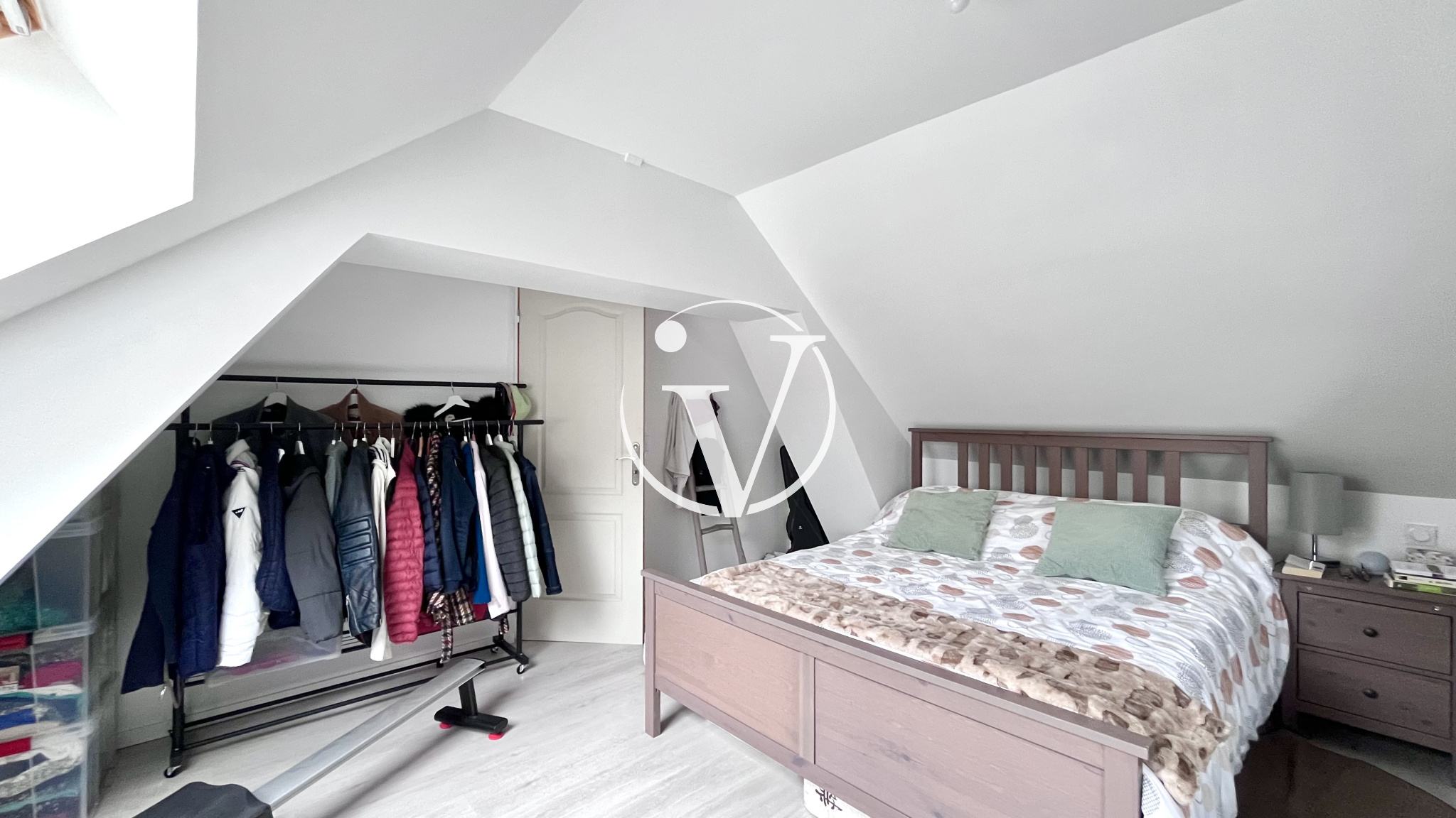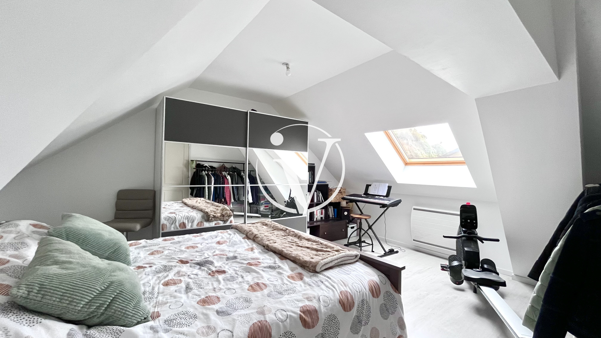 À l’étage : un palier dessert deux chambres, wc.