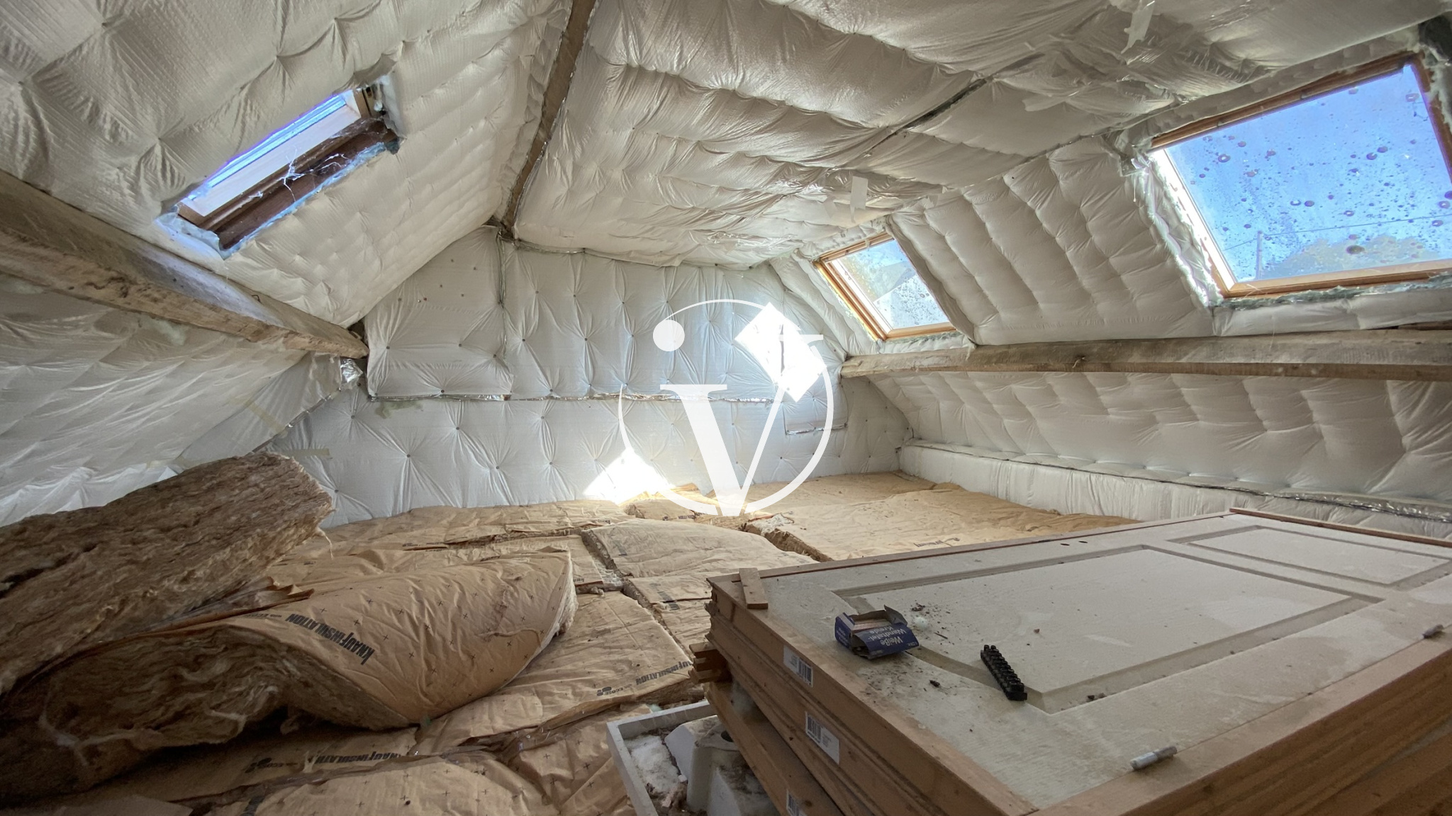 À l’étage, un grenier aménageable déjà isolé d’environ 92 m² permet d’envisager plusieurs chambres supplémentaires.
